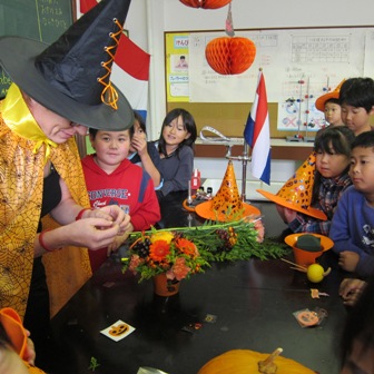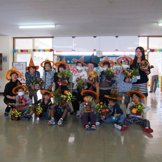 1年生11人、4年生21人、の歓声の中、魔女に扮したドレーン先生のレッスンが始まりました。 完成したかわいいアレンジを津波に流された花好きおじいちゃんに供えるという子も・・・、 まだまだ被災地のみんなが、心から笑える日は遠いいようなきがします。 お花の力がほんのちょっとでも、助けになれば、そんな思いでかよっています。