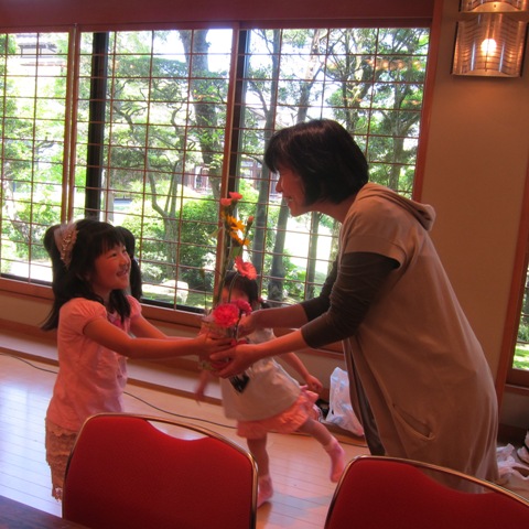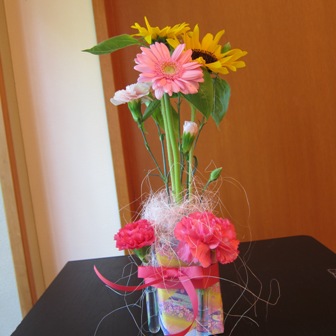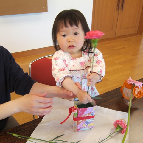 起雲閣に12人のお友達が集まりました。 牛乳パックに和紙をはり、カーネーション、ヒマワリ、ガーベラなどを可愛くアレンジ!! ママも笑顔で♪ 6月花育 22日の予定です。
