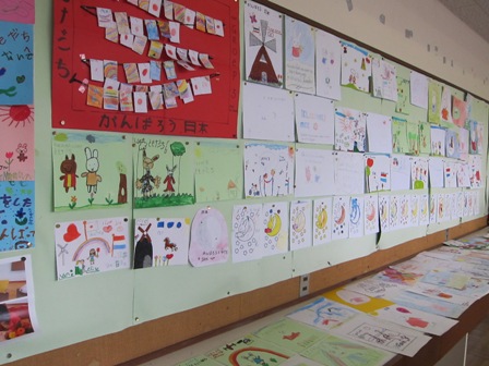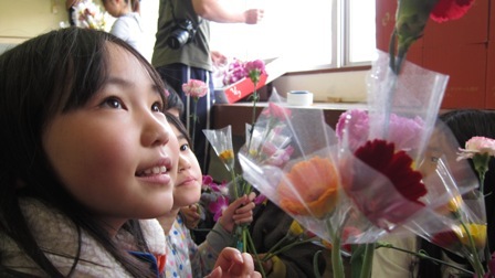 児童161名の約90パーセントの家が流され、両親,その他の家族を亡くした児童も多いという。いやと言うほど、TVで見ていた風景を目の前にして誰も、ことばがでない。驚き、空しさ、絶望、無念、そして大きな悲しみ・・・そんな思いがむねのなかでグチャグチャに・・・、しかし、ヒマワリ、ガーベラ、カーネーション、などを手にした子供達の笑顔、笑顔、笑顔!!