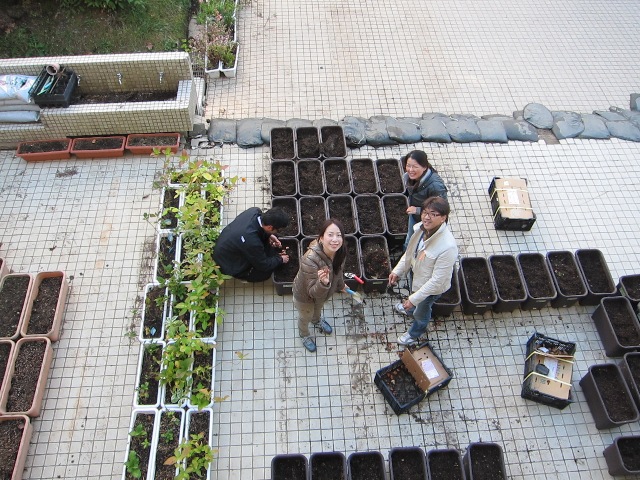 今回はガーデイナーの国吉さんの指導により、チューリップと水仙の球根をプランターに植え付けの作業も!!