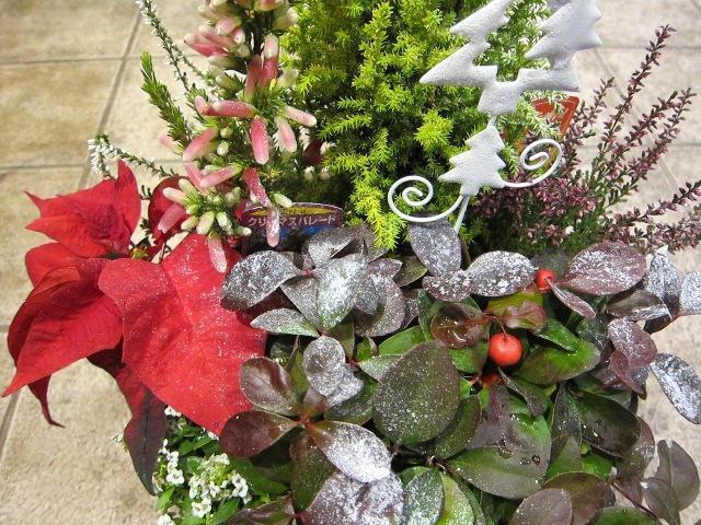 “森のクリスマス”のイメージで!! ゴールドクレスト、チェッカーベリー、エリカ(クリスマスパレード)、カルーナ、ミニポインセチア、アリッサムなどを組合せ、 仕上げに雪のパウダーを!参加者30名